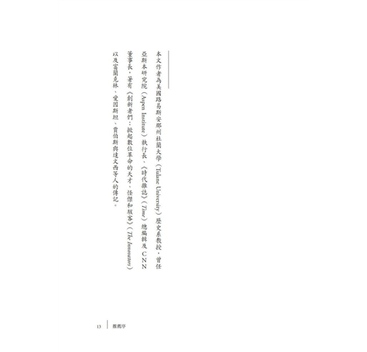 書如其人:謙卑、同理心、勇敢、智慧,正是漢尼斯的特點。本書也傳遞一項事實:成功領導不只源於自信或專業,還需要謙卑和同理心等特質。作者真誠分享他的經驗,更致力於培養下一代的領導人。──桑德爾.皮蔡(Sundar Pichai),Google執行長