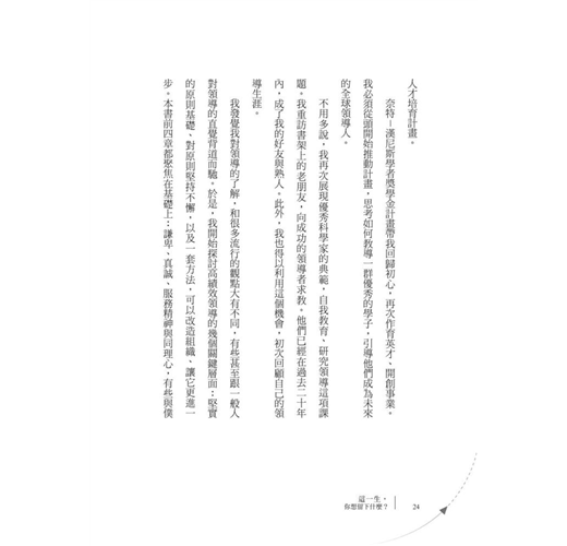 萬一領導之路走偏了,要如何修正?我寫這本書的原因之一,是為了分享我的發現給各位讀者,以及奈特-漢尼斯學者獎學金計畫培育的領導新血,並希望在我百年之後,此書能供後人參考。但其實真正的初衷是為了自己,我想整理自己領導方面的學習心得,畢竟有些是苦學而得。同時,我也想利用這個機會,從不同且相較超脫的角度,審視職涯中的重要事件。但更重要的是,我希望藉由本書的出版,促使更多人探討二十一世紀領導本質的轉變。從某些方面來看,這將有助於世人了解奈特-漢尼斯學者獎學金計畫。