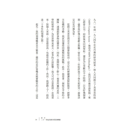切入主題前,請容我介紹一下自己的背景。一九七七年,我加入史丹佛大學時,矽谷與資訊時代才剛起步,蘋果也只創立滿一週年,英特爾(Intel)仍是一家小公司,主要製造記憶體晶片。個人電腦、網際網路、全球資訊網和行動電話都還沒誕生。我一邊教書,一邊做研究,焦點都放在超大型積體電路,以及逐漸嶄露頭角的微處理器。當時我也參與了兩家新創公司的團隊,特別是吉姆‧克拉克(Jim Clark)的視算科技(Silicon Graphics),不過主要還是以教職為重。