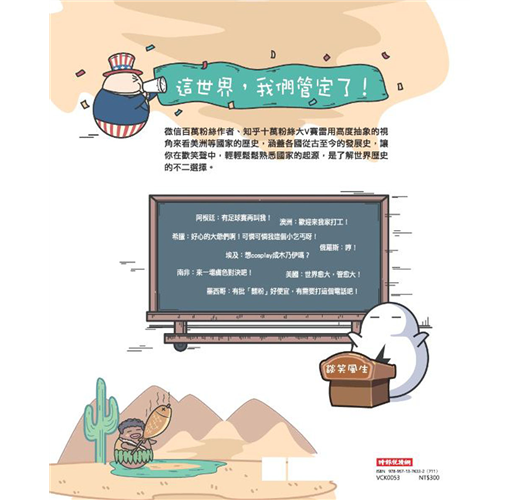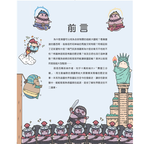 市面上歷史普及的書愈來愈多,但這一套特別不一樣。它不但深入淺出,更有著大量幫助讀者理解的插圖與漫畫,將許多國家建國與發展的歷史利用擬人的方式整理成懶人包,敘事手法幽默,人物可愛逗趣,讓這套史普書不但好看,讀起來毫不拖泥帶水,一頁接著一頁停不下來,就像是在看電影似的,完全沒有讀其他歷史書時容易出現的煩悶感。