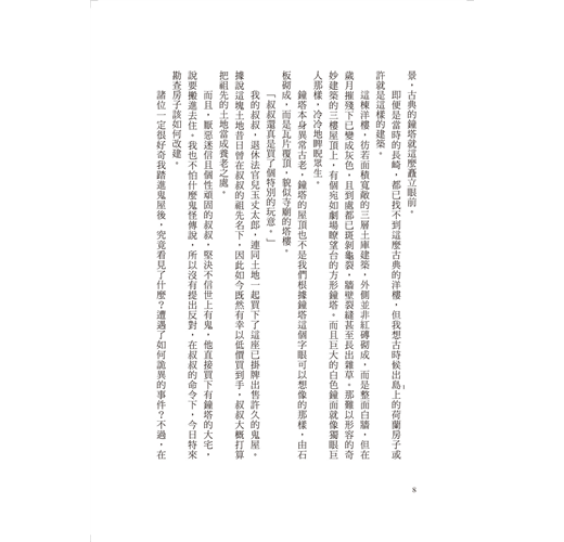 而且,厭惡迷信且個性頑固的叔叔,堅決不信世上有鬼,他直接買下有鐘塔的大宅,說要搬進去住。我也不怕什麼鬼怪傳說,所以沒有提出反對,在叔叔的命令下,今日特來勘查房子該如何改建。