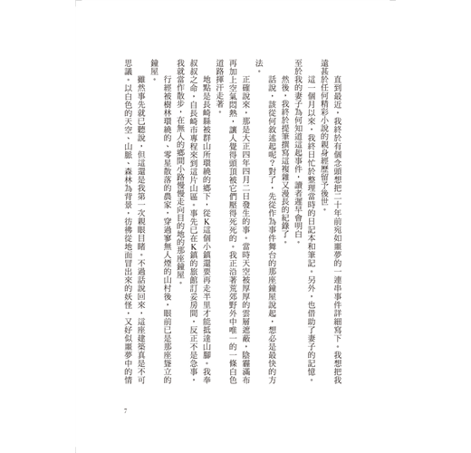 這一個月以來,我終日忙於整理當時的日記本和筆記。另外,也借助了妻子的記憶。至於我的妻子為何知道這起事件,讀者遲早會明白。