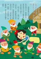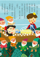 就這樣,七個小矮人每天到山裡採金子,白雪公主就在家幫忙做些家事。