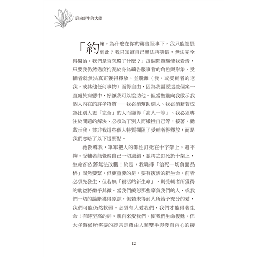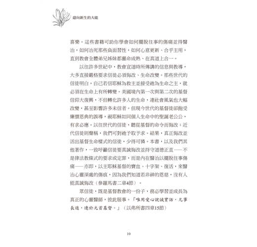 以往許多世紀中,教會宣道時所傳講的信息與教導,大多直接嚴格要求信徒必須悔改、生命改變。那些世代的信徒明白,自己若信耶穌為救主並接受祂為生命之主,就必須在生命上有所轉變。美國境內第一次與第二次的基督信仰大復興,不但轉化許多人的生命,連社會風氣也大幅改變,甚至影響許多未信者。但現今世代的基督徒卻飽受廉價恩典的誤導,視耶穌如同個人生命中的聖誕老公公, 有求必應。以往世代的信徒,聽從基督的命令而悔改;近代信徒則聲稱,我們可對祂予取予求。結果,真正悔改並活出基督生命樣式的信徒,少得可憐。本書,以及我們其他著作,一致呼籲信徒要真誠悔改並持守道德正直—不是律法教條式的要求或定罪,而是內在醫治以擺脫往事傷痛—亦即,以主耶穌基督的寶血、十字架、復活,來醫治心靈深處的傷痕,因為我們知道若非神的恩慈,沒有人能真誠悔改(參羅馬書二章4節)。