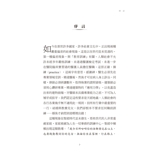 如今在普世許多國家、許多社會文化中,正出現兩種嚴重偏差的社會現象,這是以往世代從未見過的。第一種偏差現象,與「教育訓練」有關。人類社會不允許未經多年嚴格訓練、未通過醫護檢定考試、未進一步在醫院臨床實習過的醫護人員擔任醫職;這很正確。操練(practice),這兩字有意思。感謝神,醫生必須先在專業領域受訓、精通醫術,然後才可在病人身上診治。同樣,律師必須研讀數年,取得執業的證照資格。建築師必須用心鑽研專業,精通建築物的「應用力學」,以免蓋造出來的建物崩塌。牙醫師未具備專業能力之前,不可為人補牙或拔牙;我們認定這些要求是天經地義。人類社會的各行各業幾乎無不適用此一規則。但所有行業中最重要的一行,結婚與教養兒女,我們卻根本不要求任何職前訓練──婚後才納悶到底哪裡出錯!
