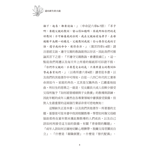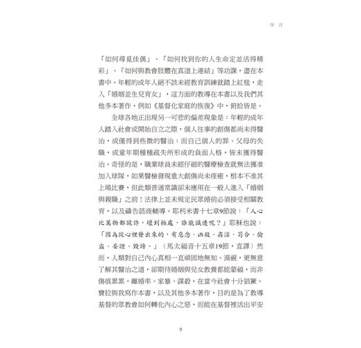 「你們作父親的,不要惹兒女的氣,只要照著主的教訓和警戒養育他們。」(以弗所書六章4節)讀者從本書,以及我們的其他著作中可得知,自從一八四○年代的工業革命到如今,家庭的角色,尤其是父職角色,已嚴重地扭曲,所衍生的惡果之一就是:兒女雖長大成人但鮮少接受父母所施予「如何經營婚姻與子女教養」的教導與訓練。因此年輕的成年人雖然在各專業領域中審慎接受裝備,但對人生最重要的這兩個行業卻非常可悲地無知!