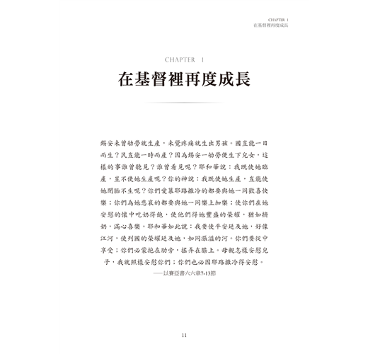 本書對於婚姻經營、子女教養與生涯規劃均提出實際的教導與訓練,探討主題包括「如何面對青春期的難題」、「成年人該如何正確地切斷心理臍帶,脫離父母羽翼而自立」、「什麼是『親職倒置』,什麼是『替代配偶』」、「如何尋覓佳偶」、「如何找到你的人生命定並活得精彩」、「如何與教會肢體在真道上連結」等功課,盡在本書中。年輕的成年人絕不該未經教育訓練就踏上紅毯、步入職場。期待眾信徒都能學習,成長為真正的心靈醫師,彼此服事。