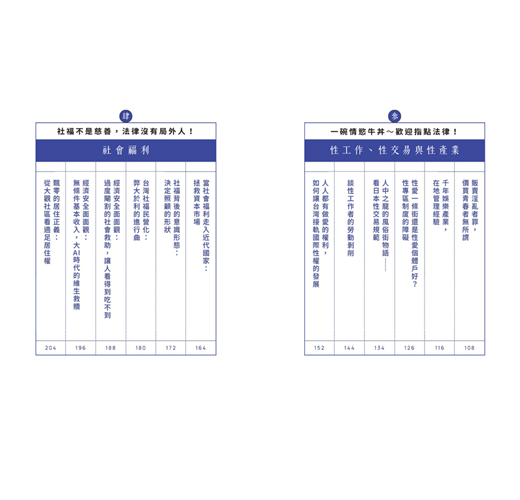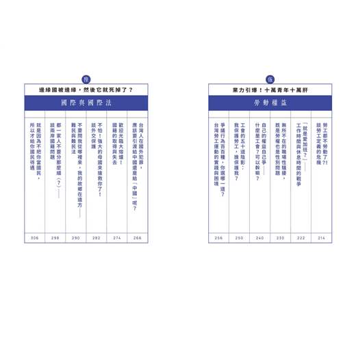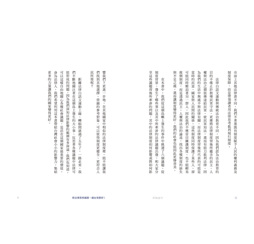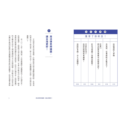 在本書中,我們從這個島嶼上發生的事件中挑選了六個議題,從制度背景、發生了哪些事以及其中所牽涉的法律議題出發,和大家分享這些議題背後所牽涉的問題,其中的法律制度如何影響或將如何影響我們?更進一步地,在其他國家中相似的法律制度裡,能不能讓我們找到其他選擇、借鏡的參考對象,可以使得制度更健全、更符合人民所需呢?