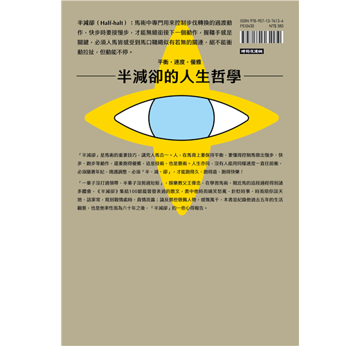 ☆☆☆☆☆☆「半減卻」是馬術的重要技巧,講究人馬合一。人,在馬背上要保持平衡,要懂得控制馬做出慢步、快步、跑步等動作,還要跑得優雅,這是技術、也是藝術。人生亦同,沒有人能用同樣速度一直往前衝,必須隨著年紀、境遇調整,必須「半.減.卻」,才能跑得久、跑得遠、跑得快樂!