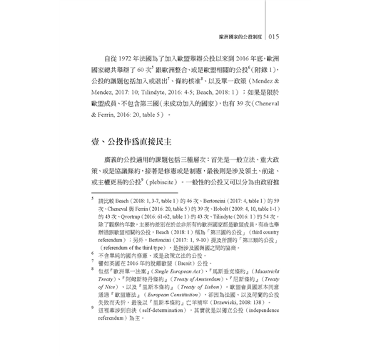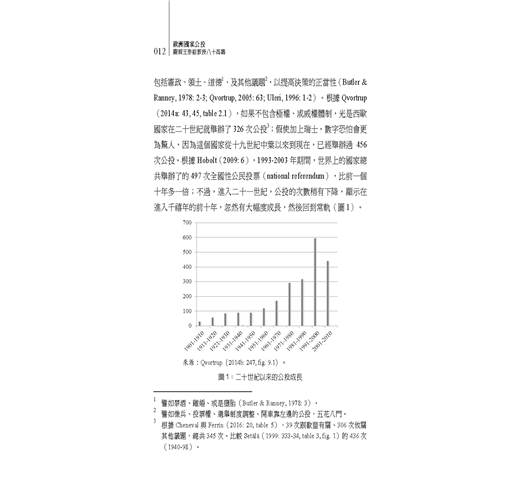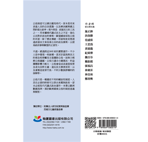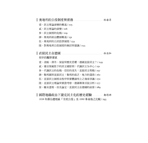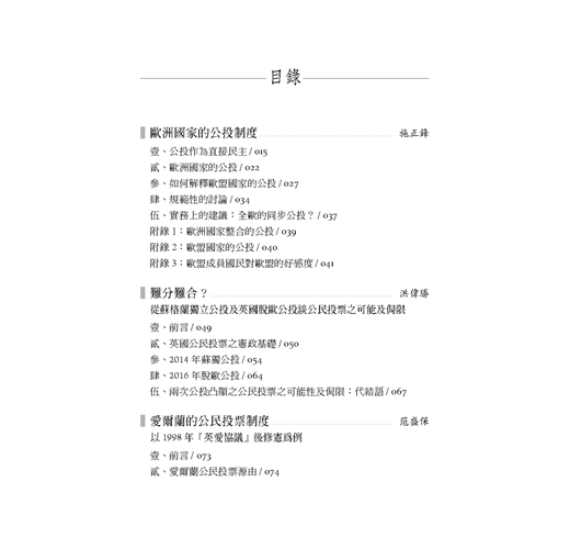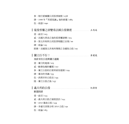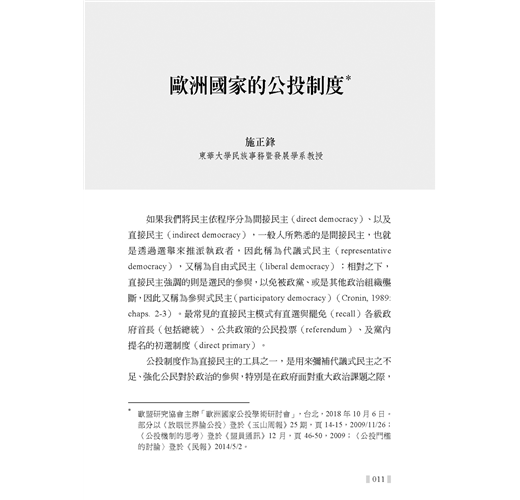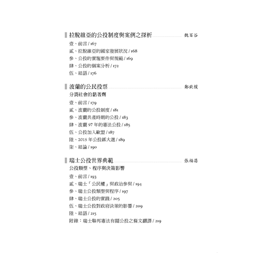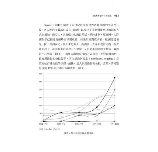 公投只是一種備而不用的輔助性制度,人民在必要的時候可以祭出來壓制政客,卻未必能取代代議式政治運作。本書以歐洲數國為例,探討歐洲國家公投的制度意義與類型。