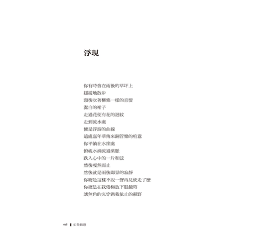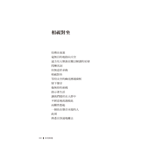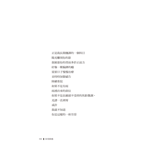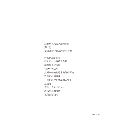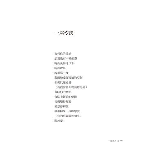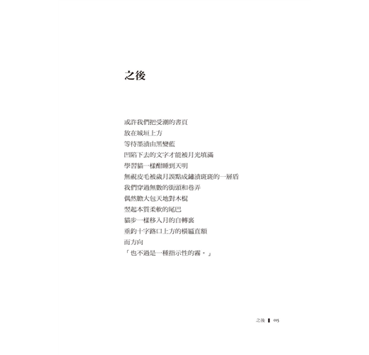 理想中一本詩集就要能夠像這樣,犯錯似地讀它, 卻又不停在裏頭指出它每個將要犯下的錯。以一種糾正的方式欣賞,同時用一種被愛的姿態原諒。我假設一本詩集天生就要能夠承擔這些的,每一首詩裏頭總有個永遠不被看見的地方,留在了讀者的身上。