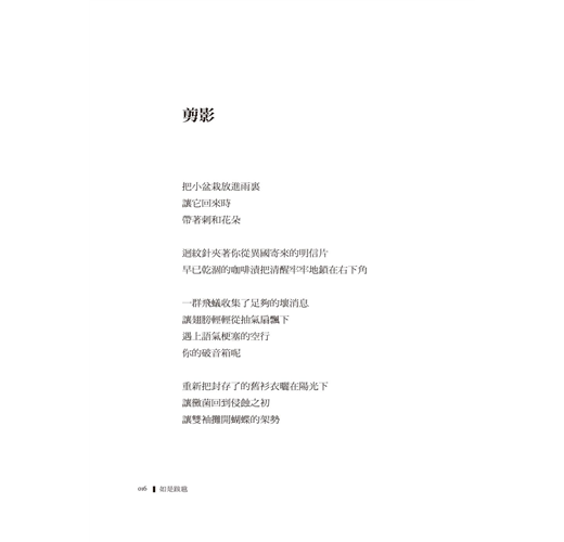 對一個已經寫詩十數年筆耕不輟的寫者如你,自言自語應該已經佔了生活中最大的部份了吧。在窮盡自己的過程中,一直找尋還可以擰乾的地方。於是詩就成為了一種必須的吶喊,甚至是那樣無用地吶喊著:你究竟要我變成怎樣(出自〈下班〉一詩)。