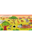 可愛動物環遊世界就此展開──來到一望無際的非洲大草原,萬獸之王獅子威風凜凜站在岩石上,居高臨下;壯碩的大象在草原間緩慢行走。想聽聽牠們真實叫聲?只要小手按下動物身旁的聲效按鈕,馬上能聽見響亮的動物叫聲;想看看猢猻樹裡藏了什麼?翻翻機關,發現狒狒家族躲在樹裡玩耍。