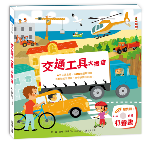 馬路上有各式各樣的車子,海上的船隻來來往往,農場裡的喀噠喀噠農具機械聲,機場上大大小小的飛機,發出轟隆隆的引擎聲。哇!世界上有好多不同的交通工具,發出各式各樣的新奇聲音,《交通工具大搜查》帶領孩子透過看一看、翻一翻、猜一猜、聽一聽,認識各種不同的交通工具。