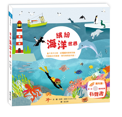《繽紛海洋世界》介紹常見的海洋主題,包括豐富有趣的沙灘活動、喧囂熱鬧的港口風情、搭船遊覽時看到的海浪、在海裡與美麗魚群的初次見面、位於南北極的冰海動物生態活動,透過全彩插圖與簡單文字,同步配合視覺、聽覺、觸覺,讓你和孩子一同認識驚奇的海洋活動,是未來的每一次珍貴旅行回憶的最佳暖身。