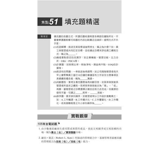 1.聚焦核心:整理各事業單位如中華郵政、台電、台糖、台酒、自來水、中油、農會、中華電信、經濟部、桃園機場、桃園捷運考古題,各類考題無所不包,無論是填充題、申論題、複選題均有收錄,並依主題予以分門別類,讓您可以迅速找到必考的重點。