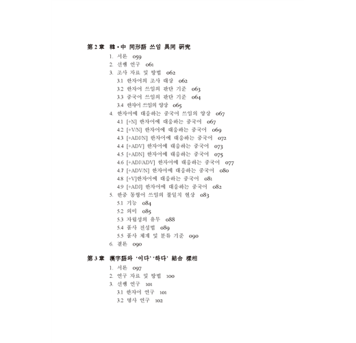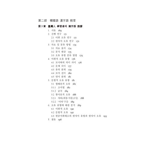 사실 4년전 한자어 연구에 처음 발을 내디뎠을 때는 매우 가벼운 마음으로 들어섰다. 가볍게 들어선 한자어의 세계는 상상 외로 복잡하고 미지의 세계로 느껴졌다. 그러나 분석 자료들이 하나 둘 정리가 되고 축적이 되면서 미지의 세계로 느껴졌던 한자어가 호기심의 대상으로 변했고 나아가 연구의 의욕을 불러일으키게 했다. 그렇게 해서 연구된 것들이 第一部에 엮어 있다. 第二部의 제5장은 내 자신이 담당하고 있는 쓰기 수업 자료에서 정리된 학생들의 한자어 오류에 대한 연구이다. 제5장의 연구는 이 책에 엮어져 있는 논고들이 나오게 된 계기라고 해야 할 것이다. 학습자들이 범하는 오류를 눈 앞에 두고 왜 이런 오류가 나올까 끝없는 질문을 내게 던지곤 했다. 그 해답을 찾기 위해 나선 것이 제1부의 연구들이다. 한자어 연구는 중국어권 학습자 대상 한국어교육 연구에서 주요 연구 과제임에 틀림이 없다. 따라서 한자어 연구가 어디까지 되어 있는지 현주소를 알고 앞으로 가야 할 방향을 제시하는 것이 향후 균형잡힌 연구가 이루어진다는 생각이 들어 연구한 것이 제6장이다. 중국어권 학습자를 위한 한자어 연구는 지금 시작에 불과하며 앞으로도 더 이어지리라 생각한다.