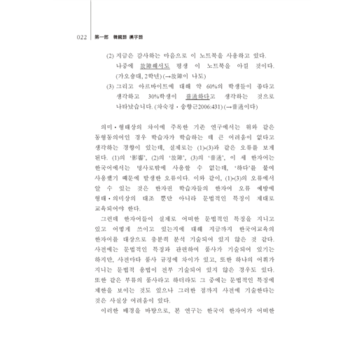 이 책은 최근에 필자가 한국어 한자어 및 한자어 교육에 관해 연구한 논고를 엮은 논문집이다. 한자어에 대한 연구는 지금까지 한자어의 단어 형성, 구조를 중심으로 많이 되어 있으며, 그것들은 국어 형태론 안에서 다루어져 왔다. 국어 형태론 안에서 이루어진 한자어 연구들은 고유어의 문법 체계 안에서 부분적으로 다루어졌거나 혹은 고유어와의 異同에 주안점을 둔 연구들이 주를 이루었다. 그러한 기존 연구의 성과는 중국어권 학습자를 대상으로 한 한국어교육 현장에서 유용하게 활용될 수 있는가 하면 그렇지만은 않은 것 같다. 그 이유 중의 하나는 기존 연구들의 논점이 중국어권 학습자들이 가려워하는 곳을 직접 긁어주지 못하기 때문이라 생각한다. 한국어교육에서 접하게 되는 대다수의 한자어는 한중 동형어이다. 이 책의 연구 자료에 의하면 한자어 1724개 중 그 대다수가 한중 동형어이다. 이는 한자어의 단어 형성에 있어서는 중국어권 학습자에게는 큰 문제가 되지 않는다는 것을 의미한다. 다시 말하면 한자어의 단어 형성, 구조는 국어의 어휘 체계 상 고유어와의 관계에서 중요한 것이지 중국어권 학습자 대상 한국어교육으로서 중요한 과제가 되지 못한다는 것이다.
