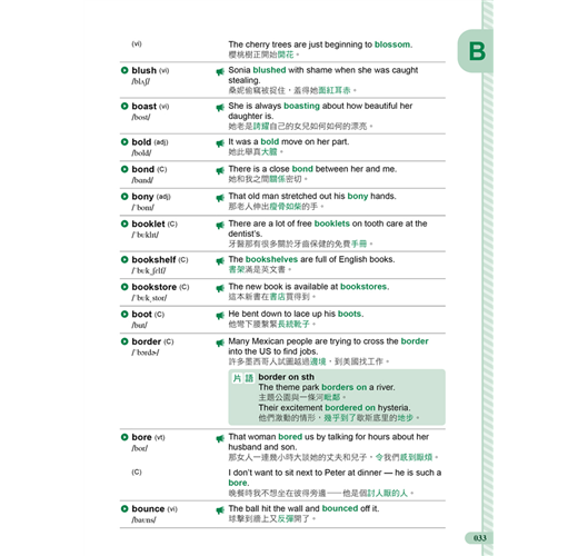 1. 單字的中文意思不單獨呈現,而是在例句的譯文中以套色顯示,除了讓讀者瞭解一個單字可以有多個不同意思外,也養成從上下文了解字意的好習慣!