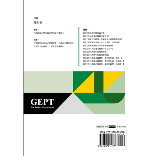 本書由教學經驗豐富的陳明華老師,特地量身為參加全民英檢中級考試的考生而撰寫,一字不漏地將 LTTC 所公布的中級單字表完整收錄。身為多本專業英語學習叢書的作者,陳明華老師深知考生的真正需求,貼心將每個單字擴充至可數、不可數、常用單複數形、及物/不及物動詞、不同詞性、不同字義、衍生字、相關字和相關片語等範疇,幫助考生從各個面向記憶單字。