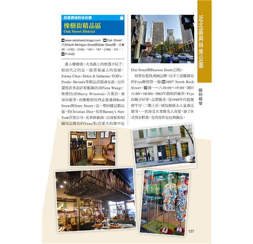 從最貴氣的Oak Street、經典的Magnificent Mile和State Street,到年輕族群愛逛的Armitage & Halsted購物街、Southport Corridor、Broadway Street等,以及該區特色店家,本書都有介紹,滿足精品愛好者、書店控、漫威迷、二手黑膠收藏者等不同族群的購物需求。