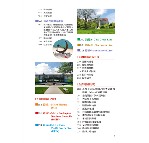 6條地鐵與火車路線,帶你前往市中心以外值得一遊的地區,體驗市井小民的生活環境,欣賞有別於繁華大城的郊區景致,例如歐巴馬總統住過的海德公園、以萊特建築出名的橡樹園,或是占地385公頃的芝加哥植物園等,都不能錯過。