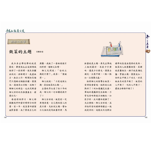 用心修出來的食物(徐英豪)/把做菜當遊戲(鄭明雪)/注意細節即修行(蔡翠霙)/一灘水的啟示(李秋慧)/做菜做到沒有自己(宋佳慧)