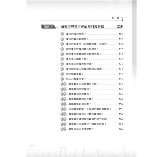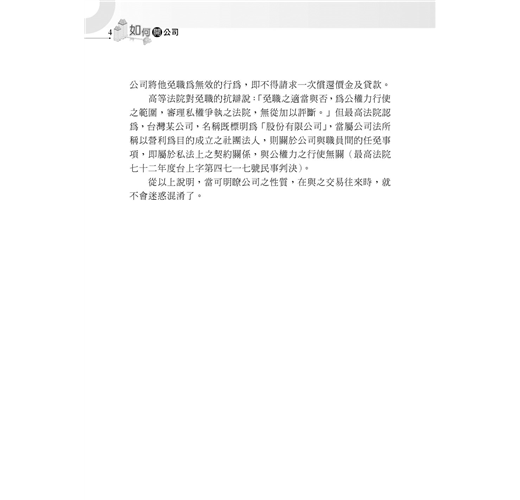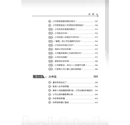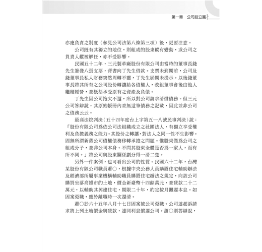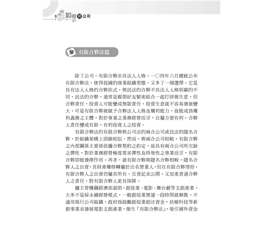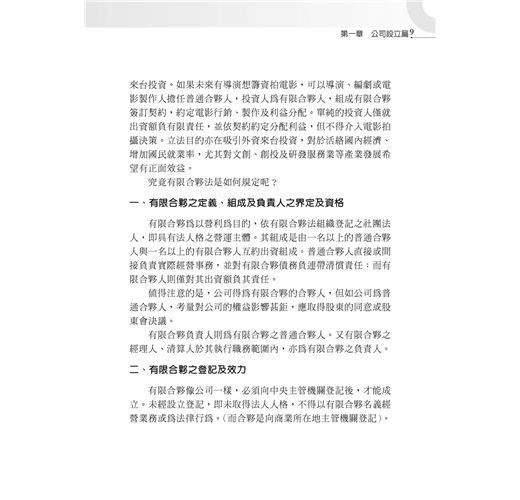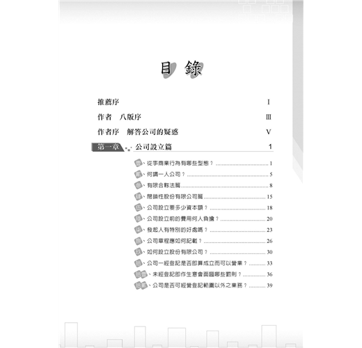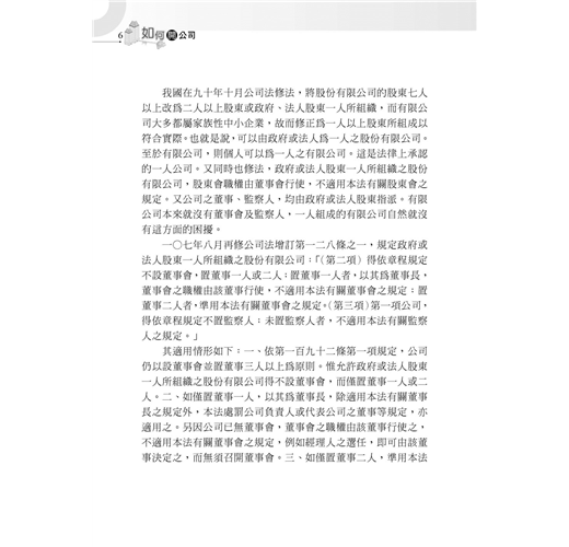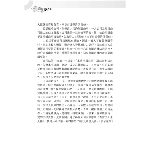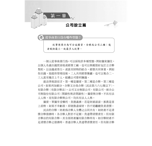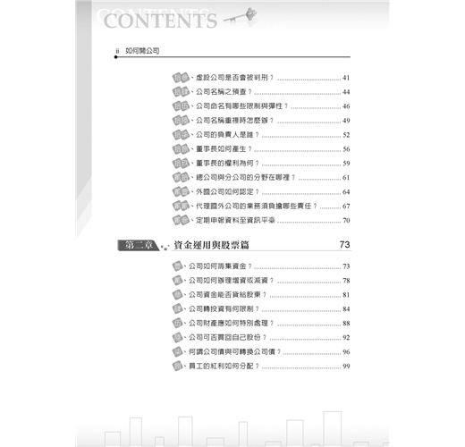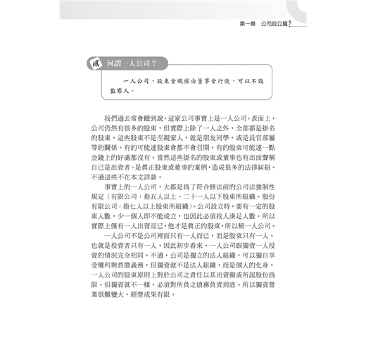 本書從最基本的選擇商業型態(如何創業?──獨資、合夥與公司的選擇)開始,談公司的命名、公司的營業項目登記、公司資金處理(公司資金能否貸給股東、短期借款的限制有哪些),到股東、董事、監察人的權責,最後談到公司的結束(合併──企業起死回生術、重整──公司再生的利器)等等,有系統、有條理的介紹有關公司的法律規範,對於剛開始從事商業行為的人,可以給予不少的幫助,在實際從事商業時,可以減少很多不必要的法律麻煩與糾紛。而對於那些商場老將,在翻讀書中文章之餘,也可給予日常工作上的助益。