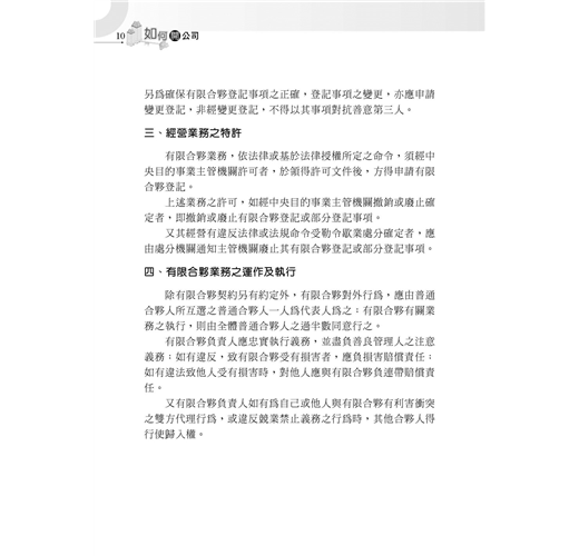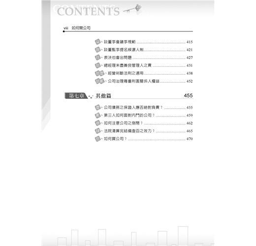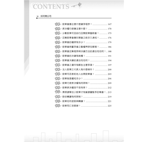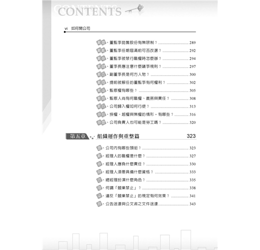 本書是從公司實務處理的角度出發,為從事企業經營的人士所撰寫的一本實用書籍。從最基本的選擇商業型態開始,談公司的命名、營業登記、資金籌集、股份發行、股東會召開、股東權利、董監事權利義務、經理人權利義務,最後談到公司的結束。以輕鬆易懂的文字,有系統、有條理介紹公司案例與法律規範。對於剛開始從事商業行為的人,以及多年商場的老將,在翻讀書中文章之餘,一定會發現對日常工作上有大大助益。