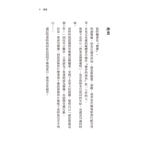 聲優就是用聲音演戲的演員。隨著對自己越來越了解,發現配音這工作真是太適合不擅長面對人群的我了。看完這本書,就像重新回顧了一段人生旅程。很驚訝梶跟我有很多相似之處,他說出了許多……連我自己都形容不出的怪怪的自己。身為躲在麥克風後面的聲音工作者,我曾經覺得自己在人際關係上不夠外放,特異獨行的性格就連自己都摸不透。但海洋的另一邊,竟有個素昧平生的人懂,還因為同一個角色牽起了緣分,這種感覺多麼奇妙。
