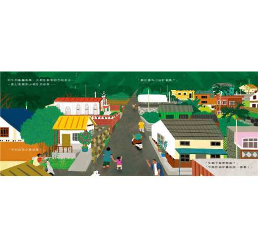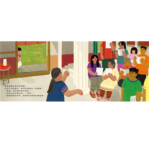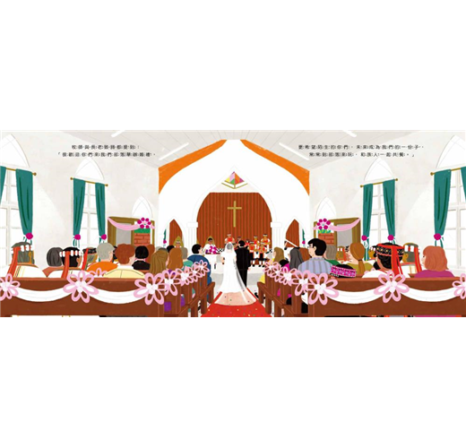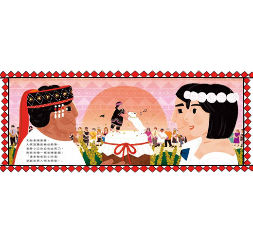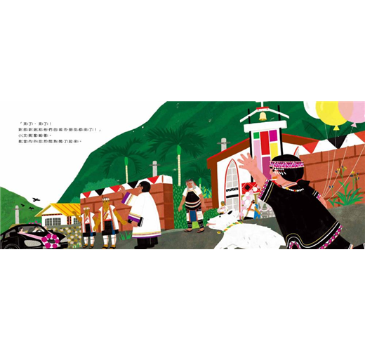 很喜歡這繪本,這對新人選擇在原住民的部落教堂舉行婚禮。繪本中展現了原住民文化的各種元素,不再是用漢民族的角度說故事;而是用原住民的觀點和視角來訴說部落中發生的新鮮事,以及部落中每個人如何同心協力,用心的準備來迎接這部落的「第一次」非原住民新人的婚禮及喜宴。