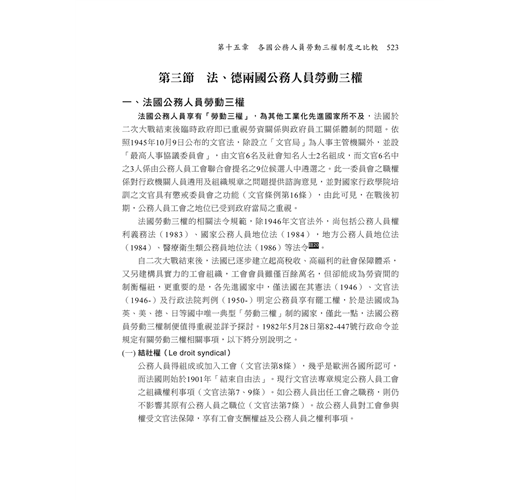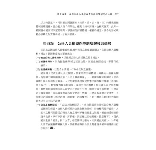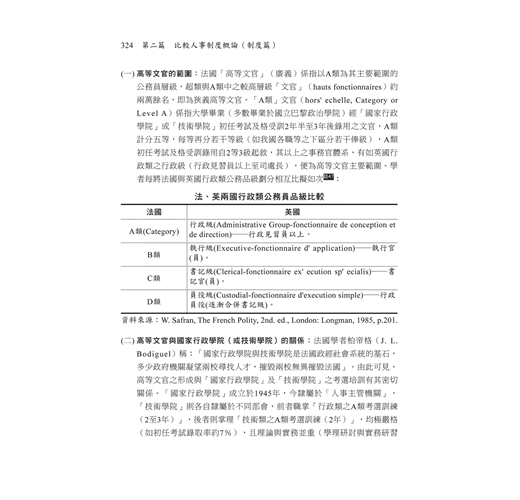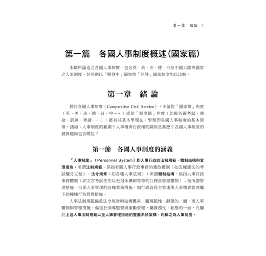 本書以論述英、美、法、德、日與中國大陸等六國的人事制度為主。全書分為「國家篇」與「制度篇」分別論說。內容取材橫跨10年,尤重近來各國之法制改革資料的比較分析。兼顧學理與制度比較之探討,為本書特出之處。