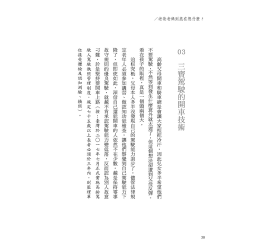 追根究柢,父母本人多半沒發現自己的駕駛能力退步了。儘管法律規定老年人必須參加講習、做認知功能檢查,讓他們察覺到自己的駕駛能力下降了,但即使如此,深信自己還能開車的人依然不在少數。越是保持零事故、守規則的優良駕駛,就越不肯承認駕駛能力變低落,反而認為是別人故意刁難,於是堅持要開車上路(按:臺灣於2017年7月正式實施高齡駕駛人駕駛執照管理制度,規定75歲以上長者必須於3年內,到監理單位接受體檢及認知測驗、換照)。
