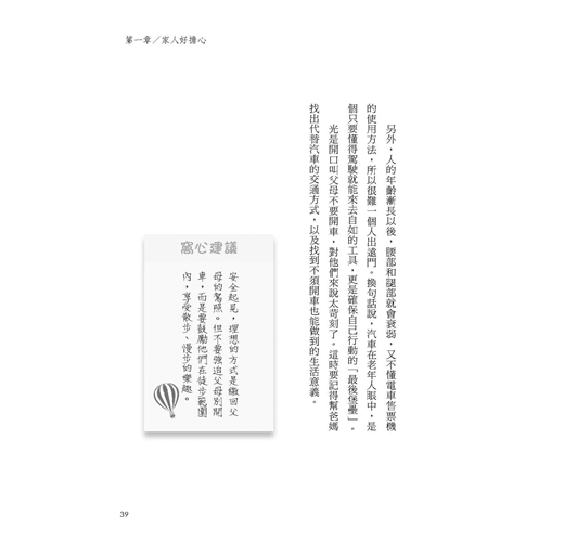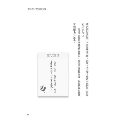 與年邁父母互動時,耐心、體貼是最低標準,本書每項案例的「窩心建議」也是很好的小撇步。這讓我想起教養小孩時,為了要讓孩子聽懂、鼓勵與引導孩子,就要不斷的動腦想方法與舉例說明。果然養小孩會變聰明,同理可證,用心與年邁的父母相處,也會變聰明吧!