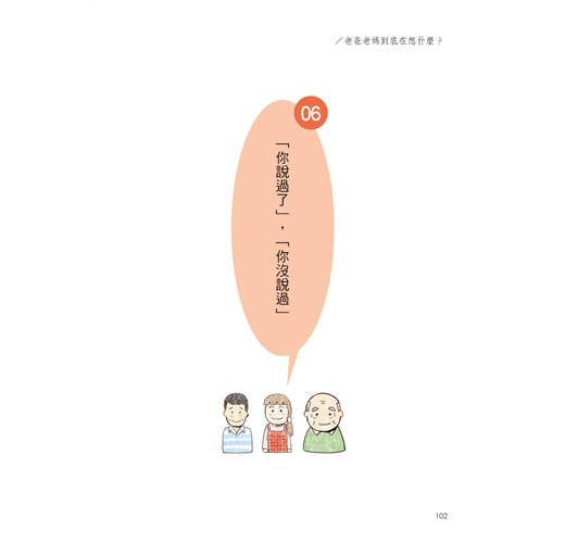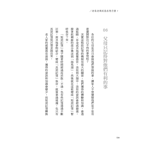 後來,他開始覺得爸媽到底是在想什麼,怎麼這麼難捉摸?一下子不要陪散步,卻嚷著要自己開車出門;家裡囤積的雜物怎麼越來越多了?而且最近聊天,開始會講一些人老了不中用的話。於是他開始覺得跟教孩子不同,小朋友多教幾次就會了,可是爸媽卻老是忘記。他甚至認為,爸媽故意要跟他唱反調。.