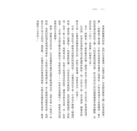 ‧以前沒什麼在看人生哲學的書,因為覺得講再多道理,不去做還是沒有用,況且也不知道這道理是不是真的正確啊。感覺《小學問》在某種程度上改變了我這種觀點。因為雖然還是得靠做沒有錯,但總要先明白正確的道理,才能走得更快更遠。