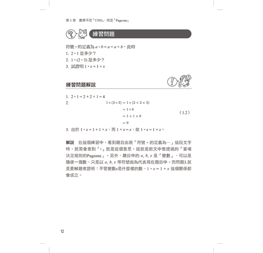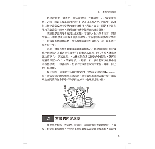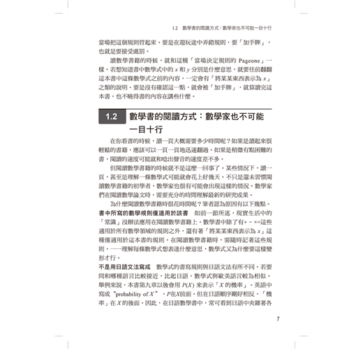 數學書籍中,常會在一開始就提到一大堆諸如「x代表某某意思」之類,看起來很單純的定義。由於在這本書之後的內容中,都會把這個定義當成理所當然的條件來使用,所以要是一開始不把這些單純的定義當一回事,讀到後面時就會覺得突然變得很難。