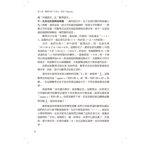 另外,我們在第十二章中說明「區間估計」時,也會出現「P(-1.96≦Z≦1.96) = 0.95」這樣的式子。讀者必須先讀懂( )內想表達的是「Z在-1.96以上,1.96以下」的意思,然後瞭解到P(…)想表達的是「( )內的事情發生的機率」,最後看到「= 0.95」時,才會明白到這個機率是0.95。照這個規則閱讀這條式子,先瞭解式子的中間部分,再逐漸往左右兩邊擴張,才能讀懂這條式子想表達的意思。
