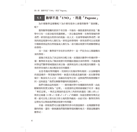 我們可藉由這些規則,一一探究幾何學中各種圖形的性質。由此瞭解到的性質又稱為「定理」,而重要的定理則會被賦予名字,像是「畢氏定理」。畢氏定理說的是直角三角形的斜邊長(圖1.1的a)與其它兩邊(b與c)有著a2 = b2 + c2的關係。知道怎麼使用畢氏定理,就可以馬上算出長方形土地的對角線長。由此可知,數學世界的定理也可以幫助我們解決現實中的問題。