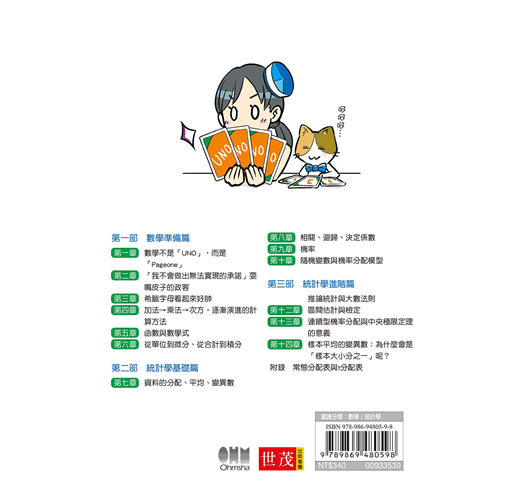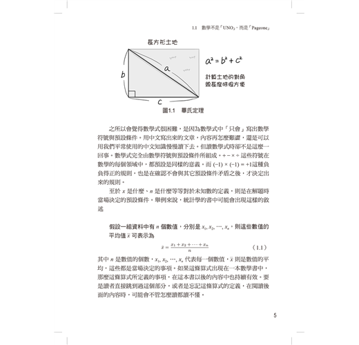在做完這些數學熱身運動後,就可進入「統計學基礎篇」,開始說明統計學的基礎原理。我們會先說明在蒐集資料之後如何進行分析,也就是所謂的「敘述統計學」。不論資料大小,我們都可以用代表值、相關、迴歸等概念說明資料的特性,我希望讀者在讀過這個部分「不只能說出每一筆資料各有不同,還能夠說出資料的組成特性」。