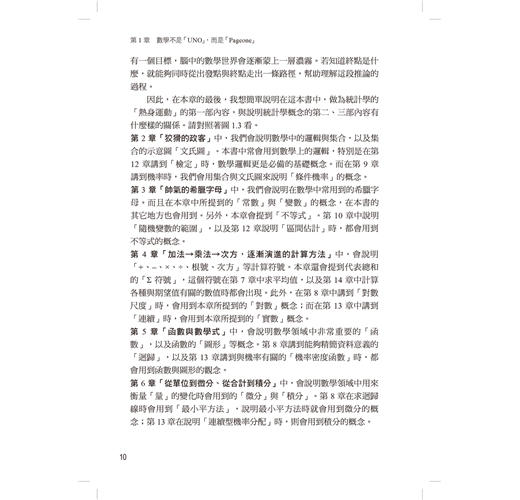 第六章「從單位到微分、從合計到積分」中,會說明數學領域中用來衡量「量」的變化時會用到的「微分」與「積分」。第八章在求迴歸線時會用到「最小平方法」,說明最小平方法時就會用到微分的概念;第十三章在說明「連續型機率分配」時,則會用到積分的概念。