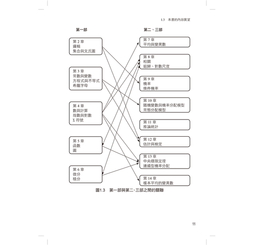 因此在本章的最後,我想簡單說明在這本書中,做為統計學的「熱身運動」的第一部內容,與說明統計學概念的第二、三部內容有什麼樣的關係。請對照著圖1.3看。