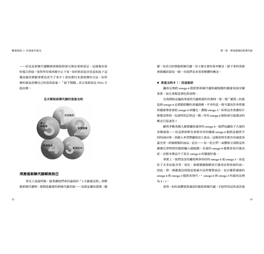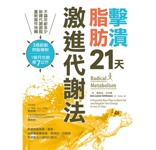 怎麼吃才能重新喚醒代謝系統?破解omega-6、omega-3的攝取迷思、告訴你被忽略的膽囊膽汁重要性等等,透過21天飲食規劃,讓細胞變好、增加燃脂效率。