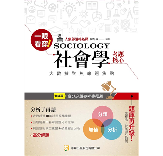 「社會學」這門考科範圍非常的繁雜及問題的流動也相當快速不好掌握,在命題趨勢上,仍以關注社會急遽變遷所造成的階層問題為考題焦點,因此社會階層議題是重要的命題熱點,尤其是影響社會流動的因素,與之相呼應的貧窮問題及女性的不平等為重要的考點;而在社會組職,則以科層組織為經典命題重點,另非營利組織的考題亦為近年的命題焦點。此外,全球化已是現代國家無法迴避的課題,因此,全球化議題考點持續增溫,而與全球化有關的世界體系觀