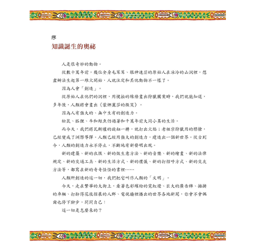 我們要告訴他們這一切是怎麼「變」出來的,不不不,我們不是要破壞孩子們美麗的童話世界,我們只是要帶他們到「後臺」,看看魔術師的帽子裡藏著什麼奇蹟,袖子裡藏著什麼奧祕,告訴他們「人類文明」這場偉大的魔法是怎樣一步步「變」出來的。