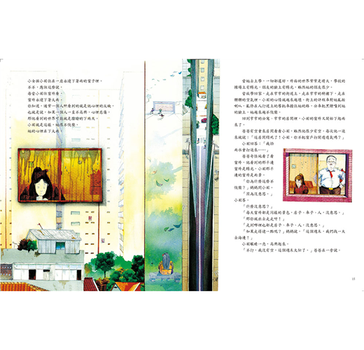 「要用拉的!」書店主人和氣地說。小羽抬起頭來,看到一張笑咪咪的臉。書店主人伸過手來把門拉開,風吹了進來,街上的摩托車和公車的剎車聲、喇叭聲一齊湧進門內來。