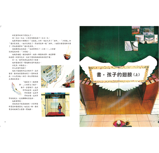 現在,小羽站在書店裡頭,她很小心地向左右看了一眼。很普通的書店嘛!跟別的書店一模一樣。那為什麼門上會有一雙翅膀呢?又是廣告花招?無聊!她失望地低下頭。