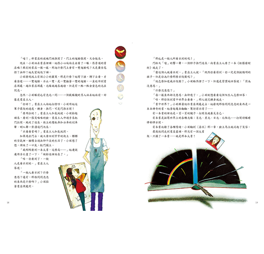 「書中世界?」小羽跟著他往書店深處走去,她發現那些閃閃亮亮的東西是一本本神奇的書,她拿起幾本翻翻,驚訝得不得了——