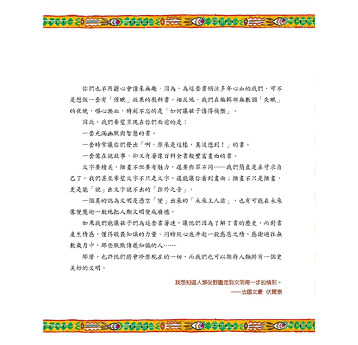 如果我們能讓孩子們為這套書著迷,讓他們因為了解了書的歷史,而對書產生情感,懂得敬畏知識的力量,同時從心底升起一股感恩之情,感謝過往無數歲月中,那些默默傳遞知識的人……