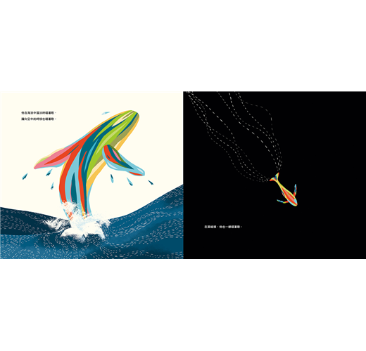 德國繪本畫家馬丁‧巴茲賽特把真實故事,轉化成豐富的水下圖畫。前半段是從發現52赫茲鯨魚的科學家視角出發,想像牠出生後,因為其他鯨魚無法聽到牠說的話,牠跟家人分離、錯過同伴、躲避捕鯨船,孤零零的生活著。「這世界上還有我在聽你說話呀!」科學家決定跳入海中,想找到鯨魚,讓牠不再感到孤單。鯨魚真的會感到孤獨嗎?在一片藍綠波光裡,以及深海的漆黑背景下,插畫家總是用華麗五彩的顏色,來呈現52赫茲鯨魚的歌聲和身影。人們總認為52赫茲鯨魚很孤單,但會不會牠其實享受著獨自歌唱的悠游時光呢?
